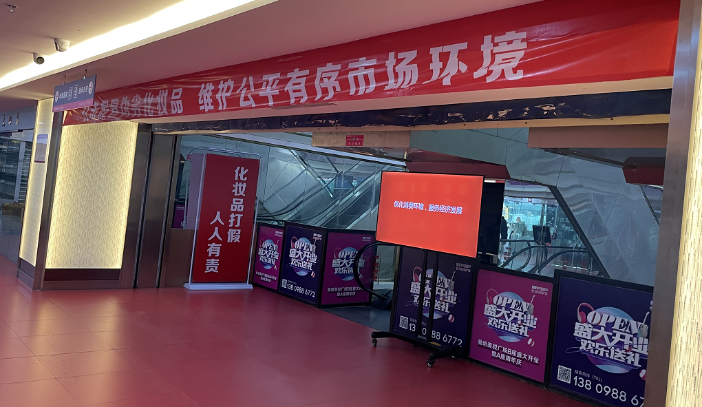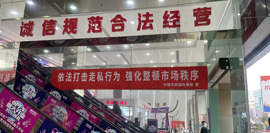 记者在曼哈、万美、远望、明通商城内发现,这些商场内到处贴有“打击走私,利国利民,全民参与,禁绝走私”、“依法打击走私行为,强化整顿市场秩序”、“诚实守法经营 合法合规宣传”、“打击假冒伪劣化妆品 维护公平有序市场”、“诚信兴商 守法共赢”等红色横幅,部分右下角标注为“华强北街道办事处”宣。