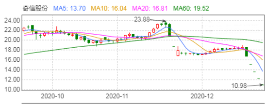 1月6日,奇信股份开盘跌停,截至收盘,股价跌10%,报收10.98元/股,封单量仍然超过33万手。而自12月16日起,奇信股份已经连续五个交易日跌停,与11月18日的高点23.88元/股相比,两个月内股价已腰斩。