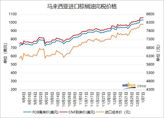 1月7日马来西亚棕榈油离岸价为1030美元,较上日持平,进口到岸价为1057美元,较上日持平,进口成本价为8200.55元,较上日涨19.34元。因市场预计12月供应将大幅减少,同时大连豆油走势强劲带来提振,马来西亚BMD毛棕榈油期货周三涨逾3%,录得连续第六个交易日上涨,盘中触及近10年高位,棕榈油进口成本价跟盘上调。目前国内进口利润持续倒挂,短期来看棕榈油期现结构、马来的低库存以及南美天气炒作等因素继续支撑油脂价格。