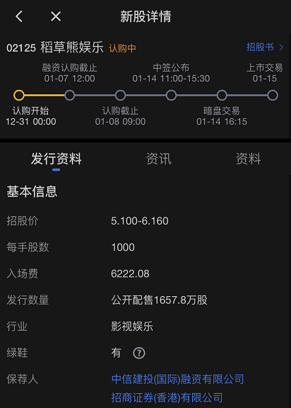近日,稻草熊娱乐发布全球招股公告。公告称,稻草熊娱乐于2020年12月31日至2021年1月8日招股,拟发行约1.65亿股股份,其中90%为国际发售,10%为公开发售,另有15%超额配股权。每股发行价5.10-6.16港元,每手1000股,入场费6222.08港元,预期将于2021年1月15日上市。招商证券、中信建投为其联席保荐人。