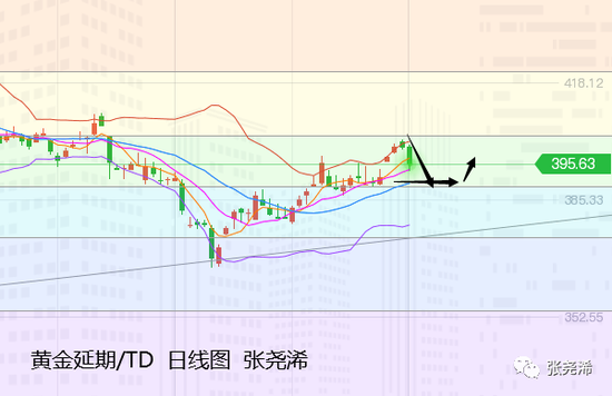 黄金TD:金价自昨日晚间开于400.86元/克后,大幅走低,延续至今日周四白盘最低触及10日均线的393.38元支撑有所止跌反弹,但根据其回撤力度,以及附图指标的信号看,空头信号仍有加强的风险,故此此支撑也有跌破的而进一步走低的预期。