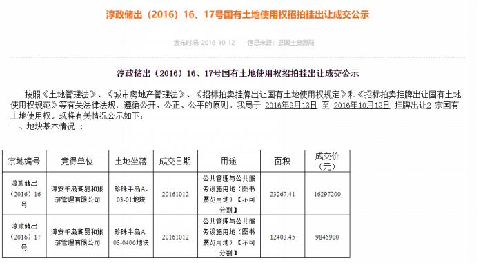淳安县规划和自然资源局的信息显示,易和旅游公司在2016年10月12日分别以1629.72万元和984.59万元购得淳安县面积为2.326741公顷的“珍珠半岛A-03-01地块”和1.240345公顷的“珍珠半岛A-03-0406地块”的土地使用权,土地用途均为“公共管理与公共服务设施用地(图书展览用地)”。这两块地的编号分别为“淳政储出(2016)16号”和“淳政储出(2016)17号”,也就是后来大白鲸(淳安)公司的项目用地。