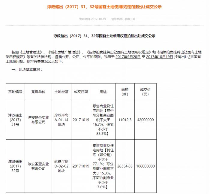 所谓的“另一块地”,就是2017年10月19日,淳安县挂牌出让的另一块“淳政储出(2017)31号”面积为1.10123公顷的“珍珠半岛A-01-14地块”土地使用权被一家淳安易圣实业有限公司(下称淳安易圣)的公司以0.42亿元购得,土地用途同样是“零售商业及住宅用地”。