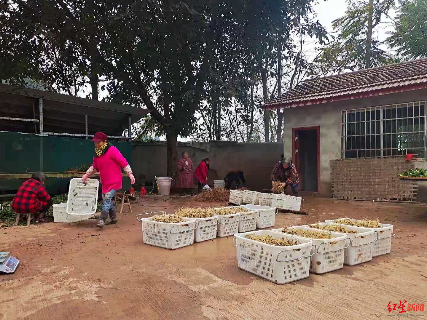 1月5日下午,在腾英公司工作人员的值守下,50名村民在大英县双古磨村的三七种植园里采挖三七。但红星新闻记者了解到,百草园公司方面的人最近三天并没有在现场。