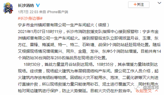 来自“长沙消防”的微博则显示:“2021年1月07日18时11分,长沙市消防救援支队指挥中心接到报警称:宁乡市金洲镇邦普有限公司一生产车间起火。”