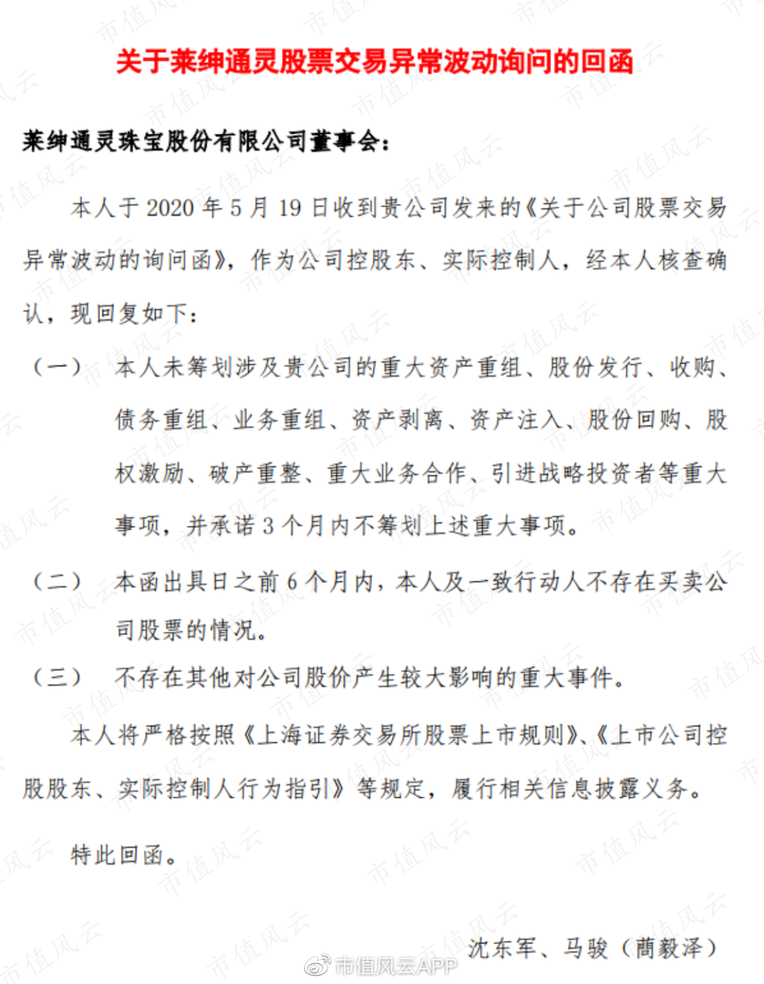 2020年5月19日,在收到交易所股票异常波动问询时,沈老板和大舅哥夫妇均表示一切正常,该披露的我们都披露了。
