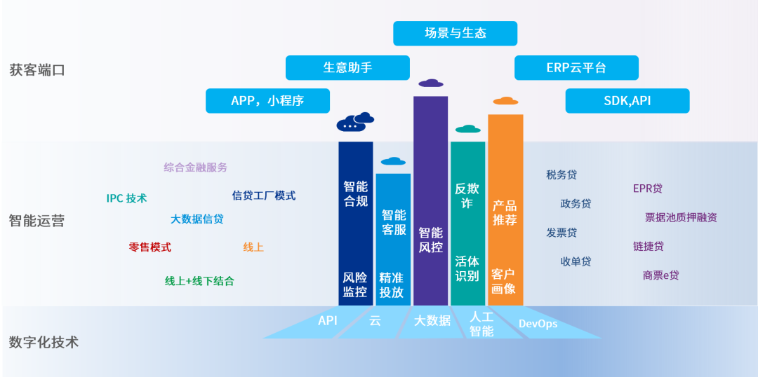 在应用场景方面,金融机构借助应用程序接口(API)等技术将小微金融服务嵌入生态化平台的相应场景中,如基于ERP云生态的信贷场景。此外,领先金融机构利用金融科技向小微企业提供进货、库存、销售、财务管理、聚合支付等管家类服务,主动吸引流量,挖掘场景中的服务机会。