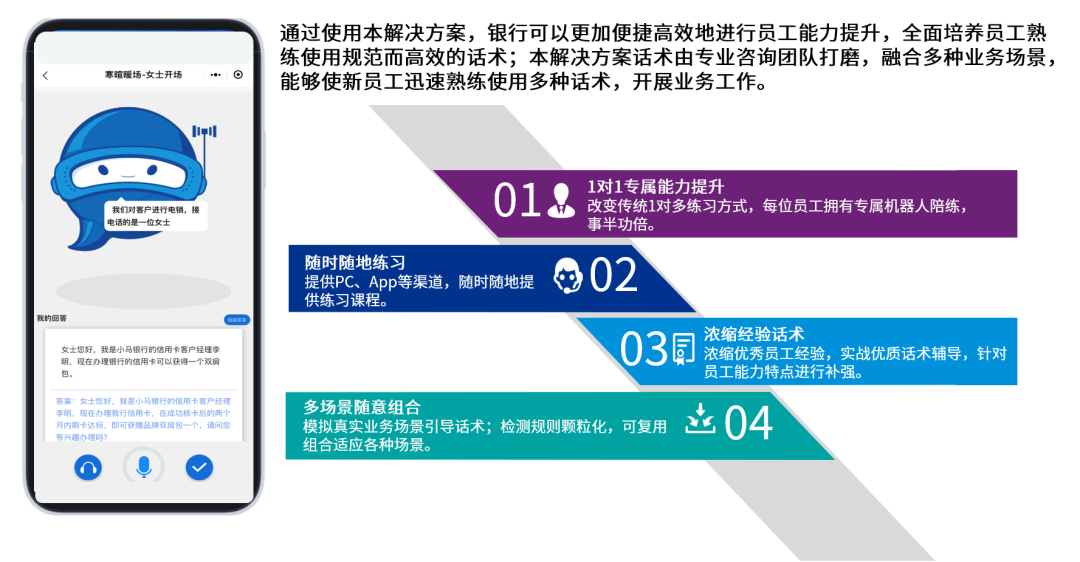 在拓宽客户触达路径之后,金融机构需着力提升客户经理的营销能力。毕马威于近期推出了针对客户经理营销话术的智能陪练应用,运用科技手段提升营销实效,取得了良好的市场效果。