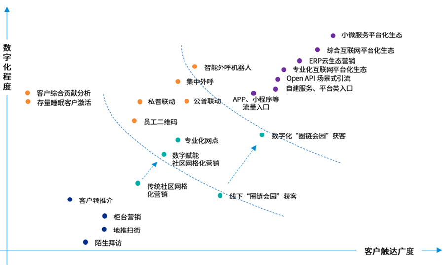 利用数字化、科技化的举措提升传统营销效能。例如利用移动设备支持展业,做到客户立等可贷,实现客户“最多跑一次”、甚至“一次不用跑”的目标,提升营销成功率和客户体验,增强客户粘性;又如金融机构积极探索区块链+核心企业的供应链金融实践,拓展客户触达的范围和深度等。