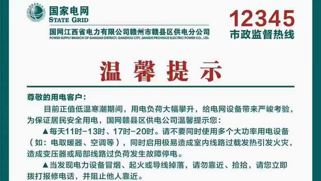 就在今天,国家电网江西省电力有限公司赣州市赣县区供电分公司发布紧急通知称,目前正值低温寒潮期间,用电负荷大幅攀升,给电网设备带来严峻考验,为保障居民安全用电,温馨提示用电客户在每天高峰时间段不要同时使用多个大功率用电设备等。