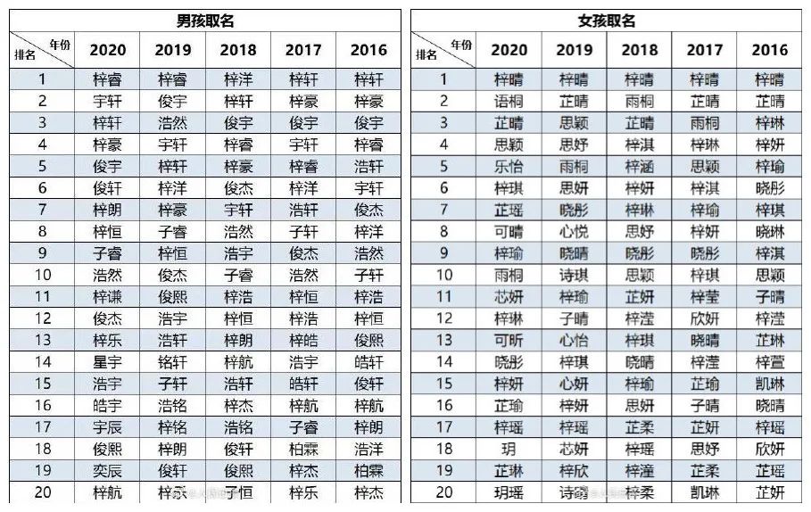 第一批“20后”诞生,对于新手爸妈而言,都想给宝宝取个寓意好的名字。近日,广东佛山市公安局公布佛山2020年新生儿取名热门名字,男孩取名为“梓睿”的最多,已连续2年排行榜首;女孩取名最多的是“梓晴”,已连续5年排行榜首。你家的孩子“撞名”了吗?(来源:人民日报)