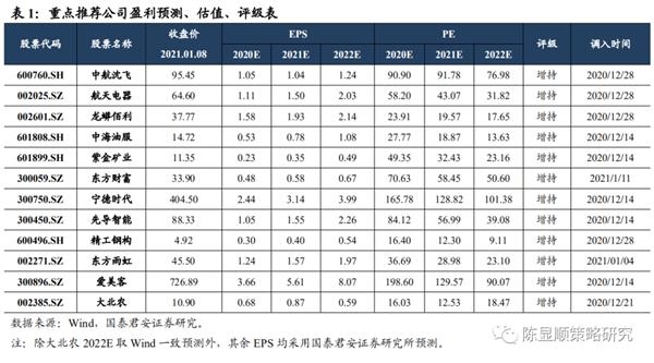 高位震荡,结构短期内推荐军工/银行/券商/有色/石化。2020年12月26日国君策略联合行业发布的专题报告《策论军工:国之重器,“十四五”的百米飞人》提示军工行业机会,大国博弈加剧下加大国防投入是必选项,军工自信息为王、干拔估值的1.0时代向同时受益于盈利与风险偏好的2.0时代转变。景气抬升下我们认为军工是全年机会。除此之外,我们看好短期景气较好的银行/券商。中期看,我们继续看好三朵金花:1)全球原材料周期——铜/铝/石化/基化;2)可选消费——酒店旅游/化妆品/白酒/汽车/家电;3)新能源科技——新能源车产业链/光伏。