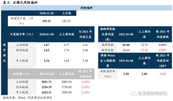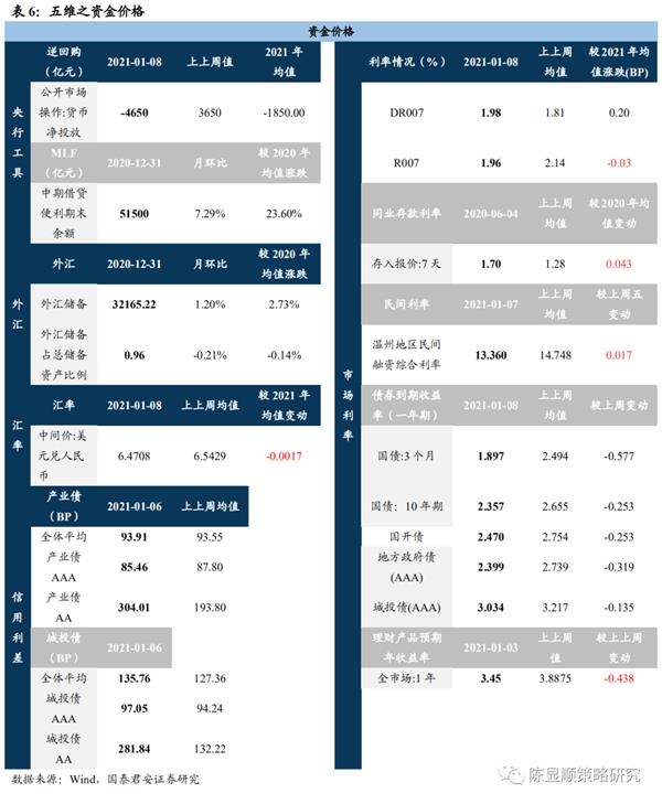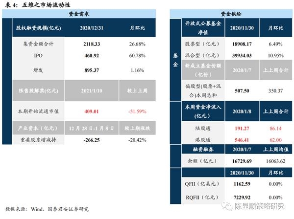 微观流动性的超预期不容忽视,密切关注2021年无风险利率下行的可能。对于当前行情的理解,我们认为关键在于分母端-流动性的超预期。在中央经济工作会议“政策不急转弯”的背景下,叠加央行引导利率下行的表述,市场有关流动性收紧的负面预期往后推延,这是自上而下的背景。但背景不是推动上涨的直接理由,关键在于微观流动性超预期。当前ETF的规模扩张、公募基金的发行火爆,本质是居民配置力量强化的结果,背后的关键是利率下行的无形之手。一方面,12月以来一年期银行理财产品预期年收益率快速下行并创下历史新低(3.45%);另一方面,一年期银行理财产品与余额宝年化利差大幅收缩,触及历史低位(1.12%)。结合国君策略《春季躁动,再添一把火——新版商业银行绩效评价办法点评》中对于无风险利率下行的判断,我们认为2021年无风险利率有望迎来进一步下行,这将成为2021年行情的核心驱动。