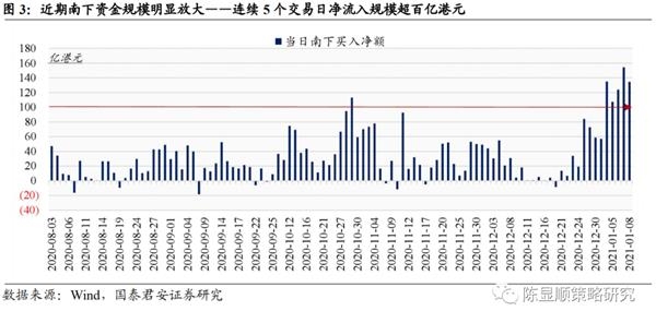 微观流动性超预期的结果,不是重演“小市值弹性”,而是强化“大市值抱团”。结合近期我们与市场的交流,当前微观流动性超预期的结果是这部分流动性进入基金而非直接入市,从而基金的边际定价决定市场的方向与结构。推演专业投资者们的思路,2019、2020年连续两年的基金高收益、2021年的宏观流动性转向、高估值压力等因素均会纳入考量。在这样的背景下,“降低目标收益率”、“看三年自下而上选股”的思路成为主导,优质赛道、确定性龙头成为抱团的核心方向。换个角度,难道市场会对高估值问题视而不见?答案肯定是担忧的,当前的南下数据便可见一斑,近期南下资金规模明显放大——连续5个交易日净流入规模超百亿港元。港股中上市公司相对优质(可比A股龙头)且估值合理,吸引越来越多的机构资金增配。高估值仅是表象,本质是A股优质资产的稀缺性与微观流动性骤增间的矛盾,南下资金还是少数。极致的风格何时结束?需等待流动性拐点。我们认为春节前出现该情形的概率极低。