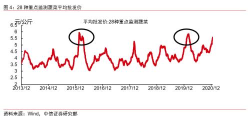 二是冷冬天气的影响。根据中国气象局预测,2021年1月全国大部分地区气温较常年同期偏低。除西藏大部、西南地区西部等地气温较常年同期偏高外,全国其余大部地区气温接近常年同期或偏低,其中内蒙古中西部、华北北部、江汉西南部、江南西部、西南地区东部偏低1~2℃。低温天气可能会对农业生产造成影响。内蒙古中西部、华北北部等地气温偏低,对设施农业、畜牧业不利。西南地区东部、江南西部可能出现阶段性低温雨雪灾害天气,对露地蔬菜、经济林果及油菜等生长不利。中国气象局同时指出:2020年12月28日以来的寒潮过程比2016年1月世纪寒潮明显偏弱,在2016年的寒潮中,华北、黄淮、江南、华南及四川等地共有179个县市最低气温跌破1月份当地建站以来历史极值;山东、江苏、浙江、福建、四川等19个省(区、市)82个县市跌破最低气温历史极值。雪线南压至广州及珠三角一带,为有气象记录(1951年)以来最南端,广州城区出现有气象记录以来第一次降雪。一般来说,寒冷天气会提高蔬菜价格,以农业农村部重点监测的28种鲜菜分析,对比2016年寒潮时期,由于鲜菜价格在2020年年初的绝对价格也较高,形成较高基数,几乎接近2016年寒潮时期的价格,再考虑到今冬的极端程度不及2016年,因此鲜菜价格预计不会大幅显著推升整体CPI同比。