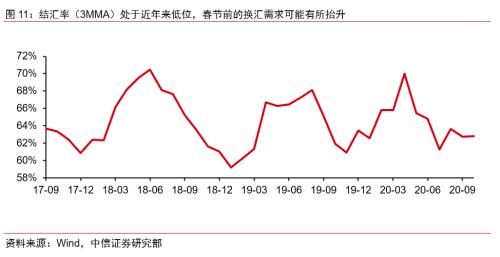 二是需关注春节前的结售汇因素变化,我们预计近期出口企业结汇需求加大可能带动人民币需求上升,推升汇率表现。以估算的结汇率观察,截至2020年11月末,整体结汇率目前在62%左右,处于2019年以来的最低水平,侧面反映了出口企业在2020年下半年人民币持续升值的背景下一直处于观望状态,并未主动结汇。但通常而言,每年春节前由于要给予员工发放薪资等需求,企业结汇需求通常在这一时期将有所抬升,因此不排除在未来一段时间这一部分企业将外汇卖出购回人民币的被动行为将有所加速,从而提振人民币需求,进一步抬升人民币汇率。而另一方面,由于出国受阻以及人民币的强势升值,居民换汇的必要性和投资意愿在短期也都不强,尽管新年以来居民换汇额度重新开放,但这一需求预计也仍将偏弱,同样将带来人民币的阶段升值压力。因此在这两类因素的边际影响下,预计美元兑人民币汇率有望进一步走强,上半年有望触及6.2-6.3一线。而从人民币升值的影响来看,我们认为这将在短期进一步加剧出口企业的汇兑损失,需要关注汇率进一步升值对出口企业的制造业投资意愿的负面影响。