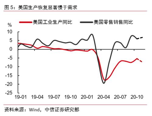 三是大宗商品涨价的持续性。我们在《宏观经济每周聚焦—2020年宏观大事记及投资启示》(20201227)中提到:2020年4月20日,WTI原油期货合约价创历史地出现负数,结算价为-37.63美元每桶,与此同时,主要大宗商品价格均显著走低,中国PPI环比最低为4月的-1.3%,同比最低为5月的-3.7%。然而到了下半年,逻辑又迅速向“经济复苏预期”切换。无论是主要由国际定价的铜,还是主要由国内定价的钢材、煤炭等都创出了价格新高,整个12月主要工业品价格均在持续上涨,螺纹钢、线材、中板、电解铜、铝锭、煤炭、水泥等环比均为正增长,根据我们的测算,12月PPI环比有望达到1.1%-1.2%的增长,折算同比为-0.3%左右。从大宗商品涨价的成因上看,我们不倾向于是流动性宽松推动,我们认为本质上还是供需错位的因素。从全球来看,以美国为代表的主要海外经济体供给恢复明显慢于需求,导致我国承担了大量的“生产任务”,因此出口始终维持高速增长。从国内来看,内需外需的共振,导致下半年工业生产和投资的需求集中释放,这两者的单月增速明显高于往年,推升了主要大宗商品价格。未来大宗商品涨价的持续性也取决于供需错位的时间长度,具体来说,一是海外特别是美国补库的需求对有色金属的拉动,二是国内基建和地产建安投资对黑色金属的拉动,三是如果年中海外疫苗可以广泛应用,包括全球经贸往来和海空运输的需求回升将对原油价格形成拉动。