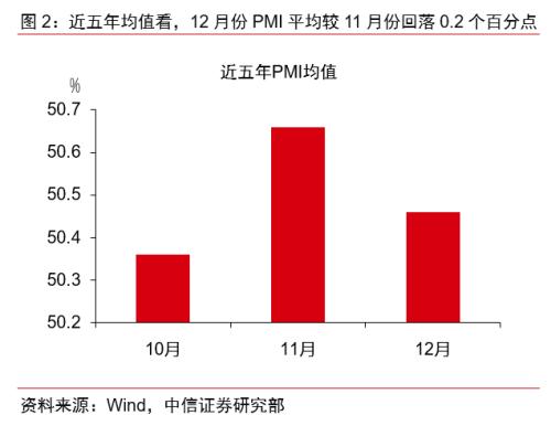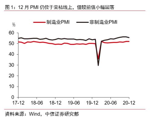 从生产的角度看,11月工业增加值同比增长7%,环比上升0.1个百分点,为2018年4月以来的最高读数,服务业生产指数同比增长8%,比上月加快0.6个百分点,高于工业增长,也高于2019年四季度水平。景气指标显示,12月制造业PMI为51.9%,较上个月回落0.2个百分点,但仍位于50以上的扩张区间。PMI所呈现出来的季度内变动确实也与过去五年的正常水平差异不大。综合生产端的最新数据,预计经济运行的趋势大概率是延续的。