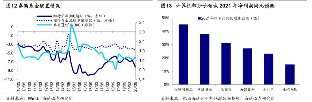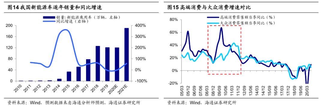 2021年行业配置的第二梯队是内需,回顾08年金融危机历史经验,货币宽松、四万亿等刺激政策推出后,高收入人群首先受益,08Q4-09Q2城镇居民人均可支配收入增速分别高于农村居民家庭人均现金收入增速的6.0%/1.6%/1.9%,这一阶段汽车、家电等耐用消费和高端白酒等可选消费行业需求旺盛,珠宝、化妆品、汽车等高端消费增速迅速上升;09Q3起随着基建、房地产投资落地和制造业、服务业用工需求扩张,农村居民收入增速逐渐超过城镇居民,粮油、食品、饮料等大众消费增速顺势崛起。2020年城镇居民收入受到疫情的影响较小,而农村居民特别是外出务工者收入受冲击较大,20Q3城镇居民人均可支配收入同比增5.4%,高于农村外出务工劳动力月均收入增速3.3%,因此2020年可选消费品中汽车和高端白酒表现亮眼。借鉴09-10年经验,预计乳制品、餐饮、超市等大众消费需求或将大增。根据海通分析师预测,2021年乳制品板块归母净利润同比增速预计为80%,餐饮预计为110%,超市预计为70%。