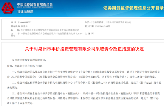 还有此次被注销的私募“泉州市丰侨投资管理有限公司”,在2019年8月也收到福建证监局的监管函,对公司采取责令改正措施,主要问题是:第一,公司管理的私募基金泉州丰创一号创业投资合伙企业(有限合伙)向2名非合格投资者募集资金;第二,公司通过私募基金永春县丰侨共享股权投资中心(有限合伙)的《投资确认书》向投资者承诺收益;第三,公司未保存永春县丰侨共享股权投资中心(有限合伙)、泉州丰创一号创业投资合伙企业(有限合伙)等2只私募基金关于投资者风险识别能力和风险承担能力的调查问卷、风险揭示书等资料,未保存公司自成立以来私募基金投资决策方面的记录;第四,公司管理的私募基金泉州丰创一号创业投资合伙企业(有限合伙)未在中国证券投资基金业协会备案;第五,公司在自行销售永春县丰侨共享股权投资中心(有限合伙)、泉州丰创一号创业投资合伙企业(有限合伙)等2只私募基金时,未自行或者委托第三方机构对上述2只私募基金进行风险评级。