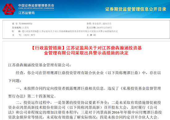 另外,此次疑似失联的几家私募,有多家曾经收到过监管的罚单。比如江苏鼎犇瀚涵投资基金管理有限公司,在2019年12月收到江苏证监局的警示函,公司在管理鹰潭巨鼎投资管理有限合伙企业中,存在几个问题:一是未按照合同约定向投资者披露鹰潭巨鼎相关信息。二是投资运作过程中,第一签署的投资协议要素不齐全;第二未采取有效措施督促被投资企业鸿景高新技术股份有限公司召开股东大会,及时履行《公司法》和公司章程规定的增加注册资本程序;第三对于鸿景高新2016年年报中应付鹰潭巨鼎投资款金额异常等情况,未采取有效措施了解实际情况;第四未按合同约定召开合伙人大会。