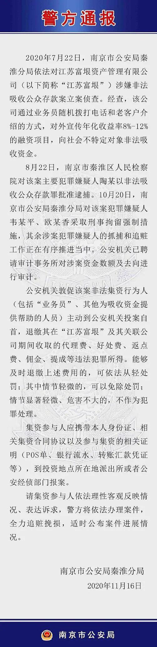 2020年11月,南京市公安局秦淮分局发布通报称,2020年7月22日,依法对江苏富垠资产管理有限公司涉嫌非法吸收公众存款案立案侦查。经查,该公司通过业务员随机拨打电话和老客户介绍的方式,对外宣传年化收益率8%- 12%的融资项目,向社会不特定对象非法吸收资金。