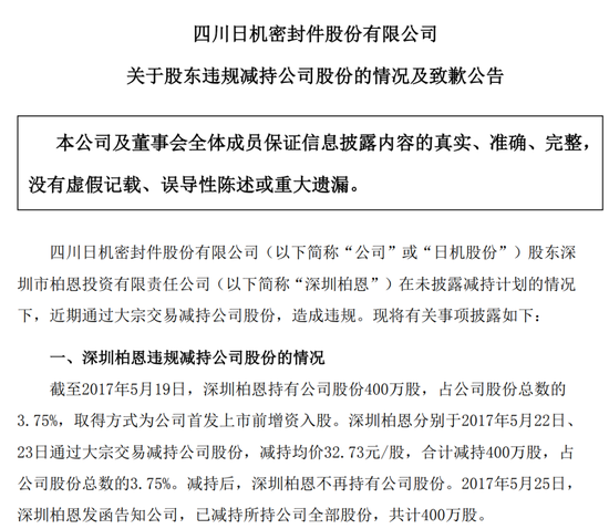 随后日机密封还收到四川证监局的问询函,关注到公司的披露,股东深圳市柏恩投资在未披露减持计划的情况下通过大宗交易减持公司股份400万股。