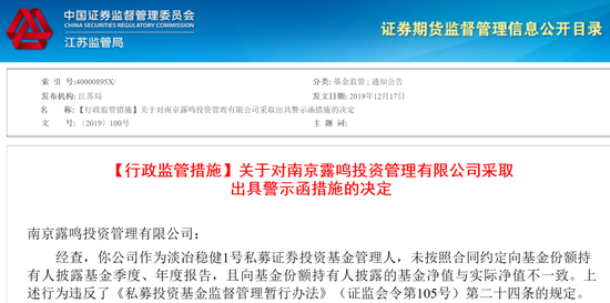还有南京露鸣投资管理有限公司,在2019年12月收到江苏证监局的警示函,公司作为淡冶稳健1号私募证券投资基金管理人,未按照合同约定向基金份额持有人披露基金季度、年度报告,且向基金份额持有人披露的基金净值与实际净值不一致。上述行为违反了《私募投资基金监督管理暂行办法》第二十四条的规定。