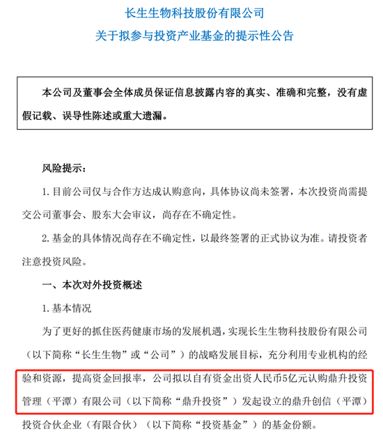 值得注意的是,2018年3月上市公司长生生物曾经公告,公司拟以自有资金出资人民币5亿元认购鼎升投资管理(平潭)有限公司发起设立的鼎升创信(平潭)投资合伙企业(有限合伙)的基金份额。