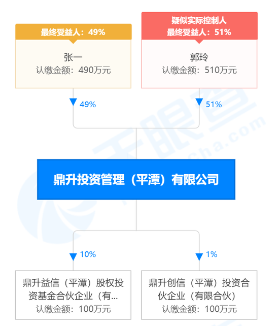 此次被注销的私募包括“鼎升投资管理(平潭)有限公司”,天眼查信息显示,其成立于2017年2月17日,注册资本1000万,实缴655.8万,股东为自然人郭玲、张一,分别持股51%、49%,郭玲是公司的法定代表人、疑似实控人。