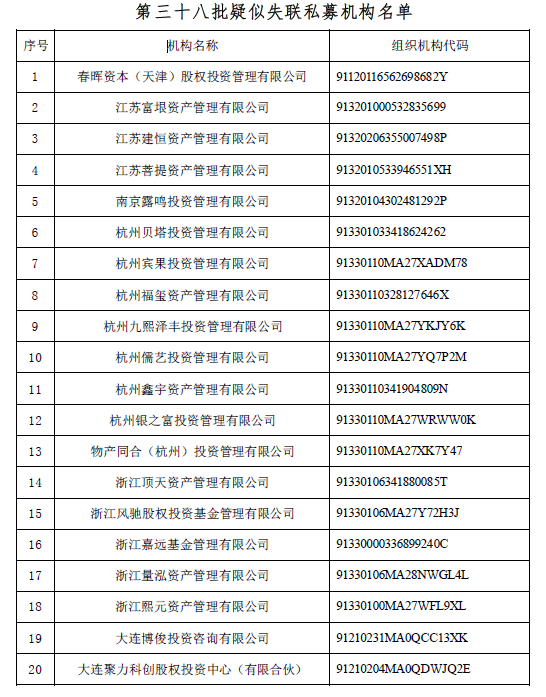 同时,基金业协会公布了第三十八批疑似失联私募机构名单,包括春晖资本(天津)股权投资管理有限公司、杭州九熙泽丰投资管理有限公司、大连聚力科创股权投资中心(有限合伙)等20家。
