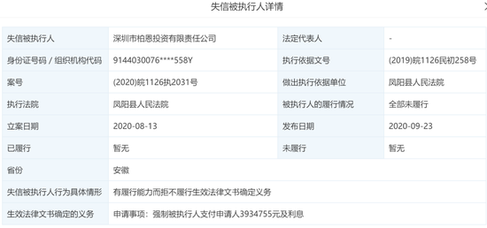 去年8月法院将柏恩投资列为失信被执行人,其有履行能力而拒不履行生效法律文书确定义务,强制被执行人支付申请人393.48万元及利息。