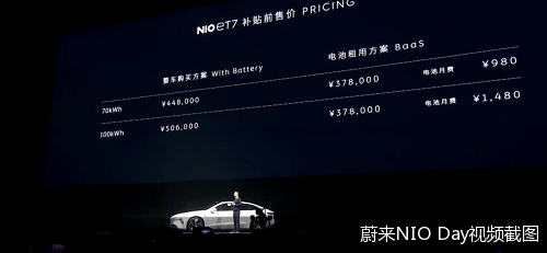 据了解,蔚来发布eT7的同时也提供两种购车方案。eT7采用整车方式购买,70kWh车型补贴前售价为44.8万元,采用BaaS电池租用方式购买,补贴前售价为37.8万元;100kWh车型补贴前售价为50.6万元,采用BaaS电池租用方式购买,补贴前售价为37.8万元。其中,70kWh电池包月租费用为980元、100kWh电池包月租费用为1480元。150kWh电池包装车后,消费者也可采用电池租用方式购买,只需交纳一定月租费用。