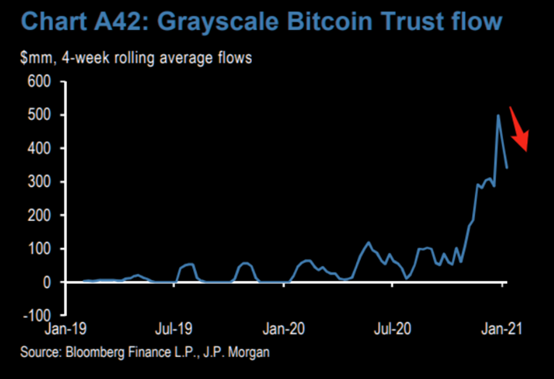 摩根大通警告,如果流入“灰度信托”的资金数量大幅放缓,比特币回调的概率将大增,出现类似2019年的大幅回调将不可避免。