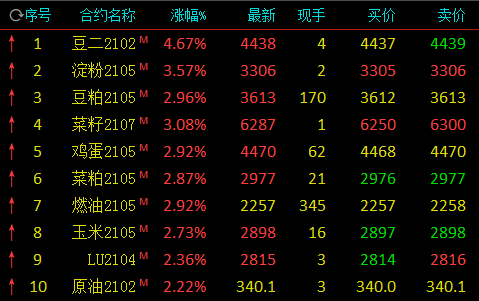 热点栏目1月11日,国内期市开盘,农产品集体飙升,豆二涨近5%,淀粉涨逾3%,豆粕、菜粕、玉米涨近3%。