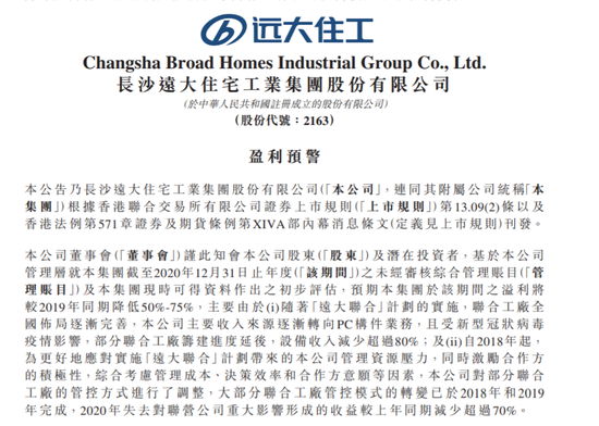 远大住工年度净利最高降75% 公司股价暴跌35%近30亿市值蒸发