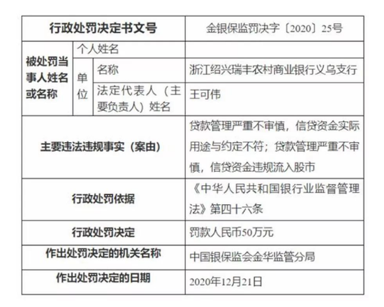 “贷款管理严重不审慎,信贷资金实际用途与约定不符”;“贷款管理严重不审慎,信贷资金违规流入股市”银保监会对瑞丰农商行的有关违法违规事实中如此写道。