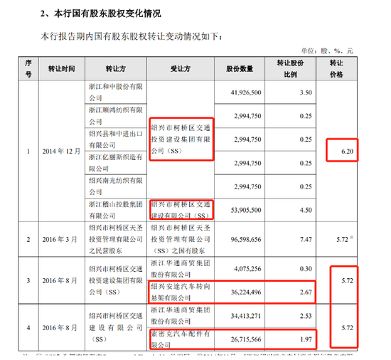 但在经过了近两年的时间等待之后,就在瑞丰宁商行正式启动IPO的关键时期,柯桥交投与柯桥交建却几乎将其所持的瑞丰宁商行股权仅以5.72元/股转让,柯桥交投将其所持瑞丰农商行中的2.67%的股份转让给了安途汽车,0.3%的股份转让给了浙江华通商贸集团股份有限公司(下称“华通商贸”),自己则仅留下了1.53%,而柯桥交建则将自己所持的4.5%的股份悉数转让给了索密克汽车和华通有限,其中前者受让1.97%,后者则受让另外的2.53%。