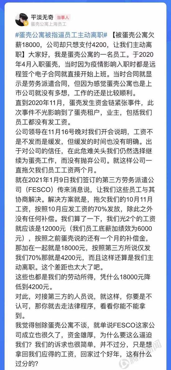 三言财经 1月11日消息,今日,一名蛋壳员工发文称,“自己于2020年4月入职蛋壳,签署了劳务派遣合同,直到2020年11月,蛋壳发生资金链紧张事件,此次事件不光影响到了蛋壳租户,业主,包括我们员工都没有发工资。”