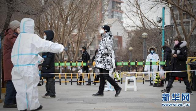 1月11日,在沈阳市皇姑区淮河街一处核酸检测点外,市民们排队等待进入。