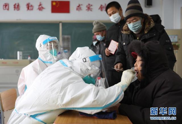 1月11日,在沈阳市铁西区彰驿学校检测点,居民接受核酸采样。