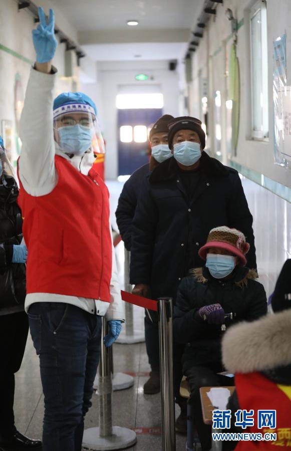 1月11日,在沈阳市铁西区彰驿学校检测点,社区志愿者组织居民排队等待检测。