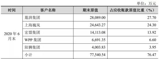 宾酷网络表示:“公司下游主要客户为国际4A公司及本土广告代理公司,具备良好的商业信誉及偿付能力。”截至2020年6月30日,宾酷网络应收账款余额前五名分别为胤湃集团、上海巍岚、宏盟集团、WPP集团、阳狮集团。其中,宏盟集团、WPP集团、阳狮集团为国际知名广告公司,而胤湃集团、上海巍岚为本土广告公司,且资本实力较弱。