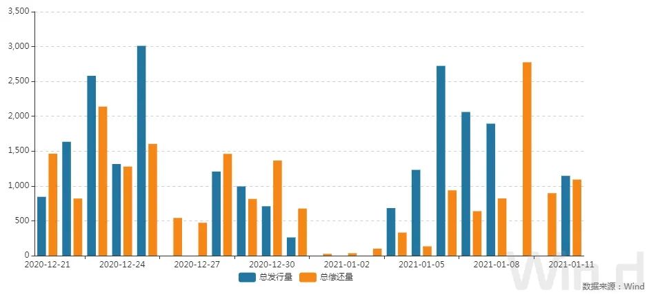 1月11日,债券市场共发行153只债券,总发行量1145.24亿元,65只债券到期,15只债券提前兑付,3只债券回售,无债券赎回,总偿还量1092.09亿元,当日净融资额为53.15亿元。