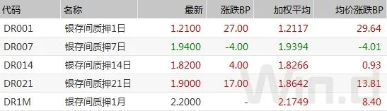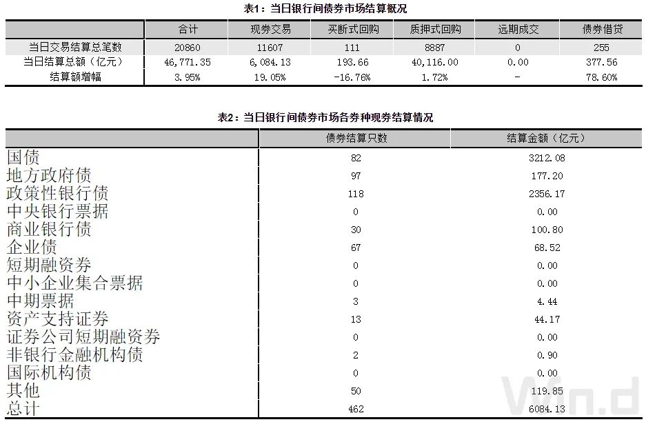 1月11日,全国银行间债券市场结算总量为46,771.35亿元,较上日上行3.95%,交易结算总笔数为20860笔。其中,质押式回购39,779.40亿元,买断式回购193.66亿元,现券交易6,084.13亿元,债券借贷377.56亿元。银行间债券市场回购利率涨跌互现,其中,7天回购利率上行1.3bp至1.997%。