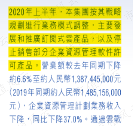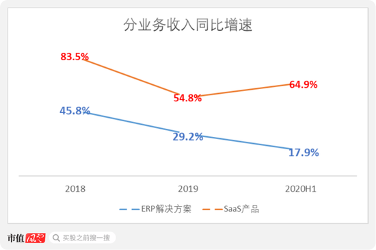 2020年上半年,SaaS产品收入达到3.3亿元,接近同期ERP解决方案的收入3.4亿元。