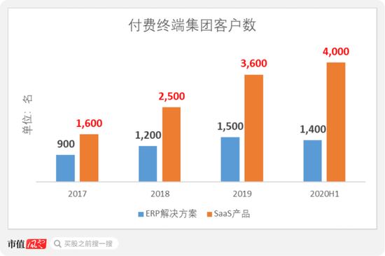 而ERP解决方案的付费终端集团客户数从截至2017年末的900名增长至截至2019年末的1500名后,2020年上半年出现了下滑,回落至1400名。