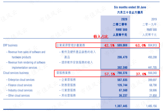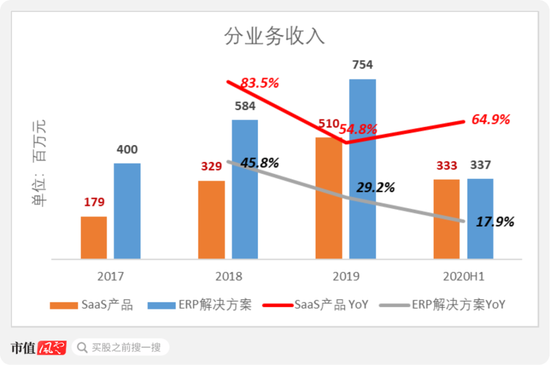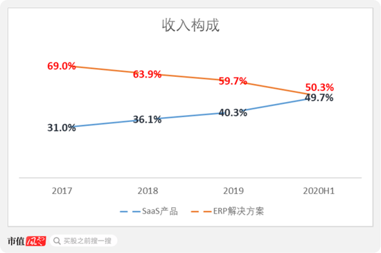 2020年上半年,SaaS产品和ERP解决方案的收入占比分别为49.7%和50.3%,两者基本持平。
