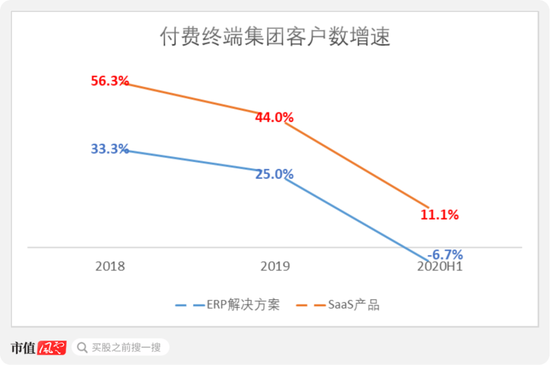 SaaS产品付费终端集团客户数在2018年和2019年分别同比增长56.3%和44.0%,2020年上半年仅较2019年末增长了11.1%。
