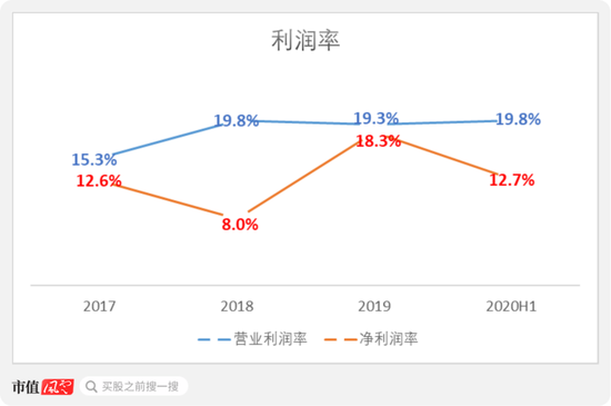 公司营业利润率呈现逐渐上升趋势,2019年和2020年上半年分别为19.3%和19.8%。净利润率在2020年上半年为12.7%。*更正图中2018年净利润率为17.9%